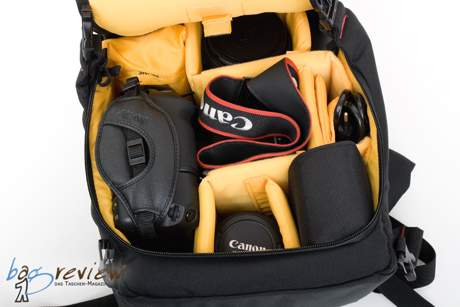 - schlechte Anpassbarkeit des Innenraumes bei kleineren DSLRs, es bleibt rechts und links des Kameragehäuses viel nicht nutzbarer Leerraum