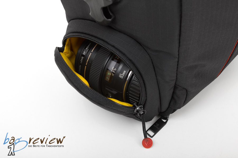 Der KATA Access-16 PL gelingt dies aber uneingeschränkt. Die Griffe der Reißverschlüsse, die unter dem Aspekt des leichten Gewichts entwickelt wurden, werden zwar nicht sehr viel mehr als 1-2 Gramm Gewichtsersparnis bringen, sind unter ergonomischen Gesichtspunkten aber eine hervorragende Idee, die an dieser Toploader-Tasche gelungen umgesetzt wurde. Das Öffnen der Fächer ist deutlich angenehmer, als bei gewöhnlichen Reißverschlüssen und geht dank der langen Nylonschnüre auch einhändig sehr gut. Zum Schnellöffnen des Hauptfaches mit dem angenähten Handgriff muss die Tasche zwar befüllt sein, doch dann klappt das Ganze wie es soll. Trotzdem empfiehlt es sich eine zweite Hand zu Hilfe zu nehmen, die den unteren Teil der Tasche festhält.